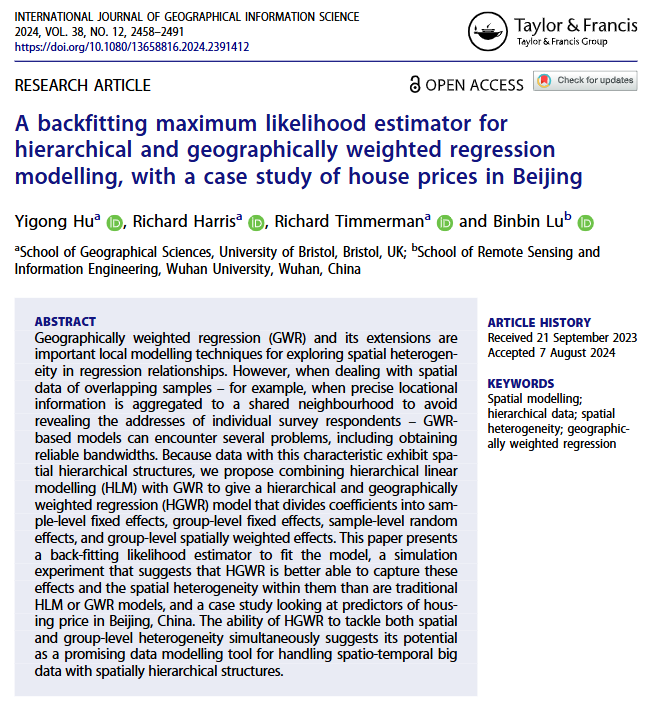 将分层线性模型 (HLM) 与 GWR 相结合,构建新的分层地理加权回归 (Hierarchical and Geographically Weighted Regression, HGWR) 模型。 [https://doi.org/10.1080/13658816.2024.2391412](https://doi.org/10.1080/13658816.2024.2391412) To discover more, goto : [Literature Introductions](https://mp.weixin.qq.com/s/A7hW8nLMTzmmtaWGeItIJw)