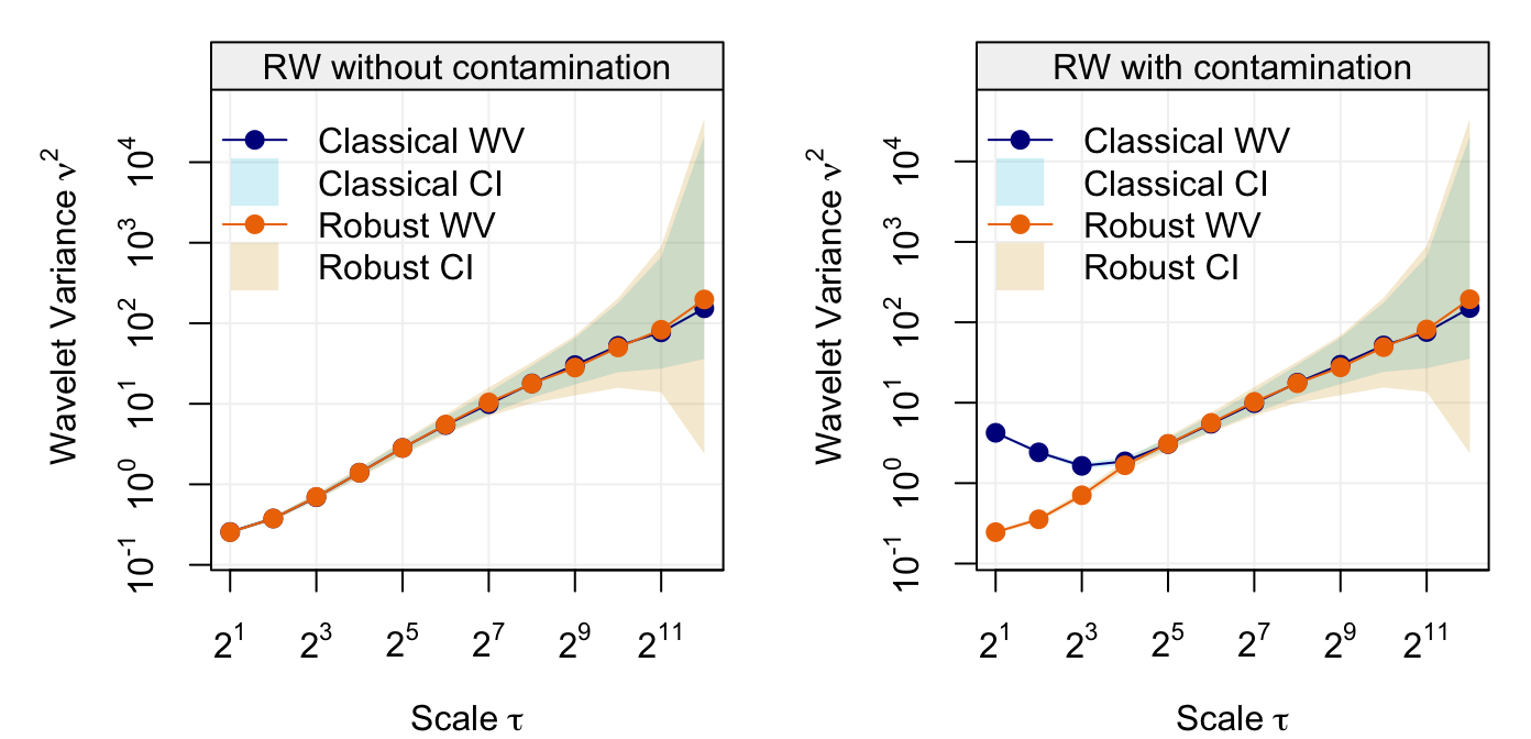 It can be seen how the classic and robust wavelet variance estimates agree when there is no contamination (left plot) but they classic estimates are heavily biased (especially at the first more informative scales) when the random walk has only 1% contamination.