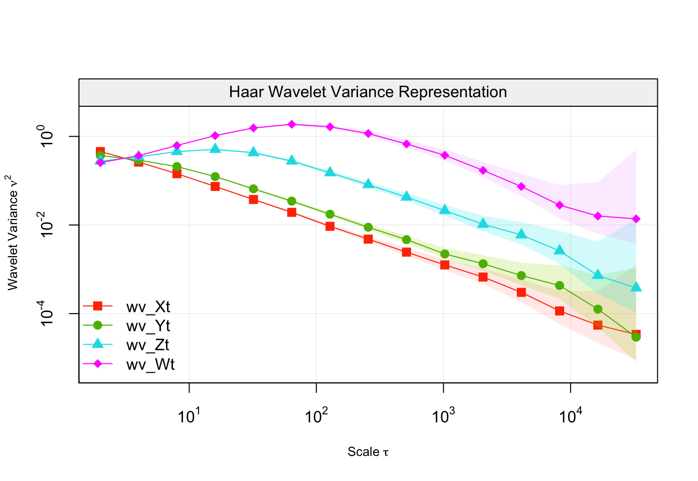 their respective wavelet variances in a log-log plot applying the